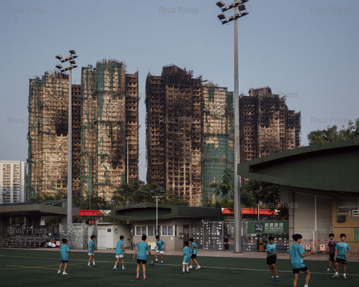 Légende : Entrainement de football devant les immeubles résidentiels de 'Wang Fuk Court' une semaine après l'incendie ayant fait au moins 159 morts . Tai Po, Nouveaux territoires, Hong Kong, le 4 décembre 2025. © Lucien Lung / Riva Press *** Football training outside the 'Wang Fuk Court' residential buildings one week after the fire that killed at least 159 people. Tai Po, New Territories, Hong Kong, December 4, 2025. © Lucien Lung / Riva Press