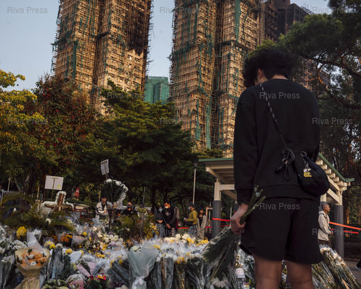 Légende : Des Hongkongais apportent des fleurs, laissent des messages et viennent se recueillir au pied des immeubles résidentiels de 'Wang Fuk Court' une semaine après l'incendie ayant fait au moins 159 morts . Tai Po, Nouveaux territoires, Hong Kong, le 4 décembre 2025. © Lucien Lung / Riva Press ***
