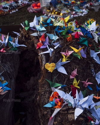 Légende : Hong Kong residents bring flowers, leave messages--including origami of cranes--and pay their respects at the foot of the Wang Fuk Court apartment buildings a week after the fire that killed at least 159 people. Tai Po, New Territories, Hong Kong, December 4, 2025. © Lucien Lung / Riva Press