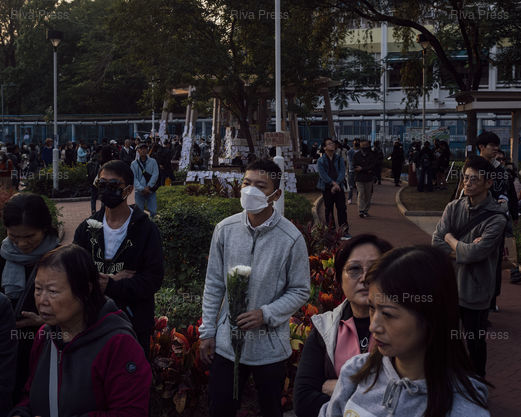 Légende : Des Hongkongais apportent des fleurs, laissent des messages et viennent se recueillir au pied des immeubles résidentiels de 'Wang Fuk Court' une semaine après l'incendie ayant fait au moins 159 morts . Tai Po, Nouveaux territoires, Hong Kong, le 4 décembre 2025. © Lucien Lung / Riva Press ***