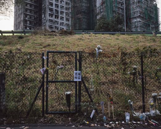Légende : Des fleurs laissées devant les immeubles résidentiels de 'Wang Fuk Court' une semaine après l'incendie ayant fait au moins 159 morts. Sur le papier : 'chagrin'. Tai Po, Nouveaux territoires, Hong Kong, le 4 décembre 2025. © Lucien Lung / Riva Press *** Flowers left in front of the residential buildings of Wang Fuk Court a week after the fire that killed at least 159 people. The words on the paper read: 'grief'. Tai Po, New Territories, Hong Kong, December 4, 2025. © Lucien Lung / Riva Press