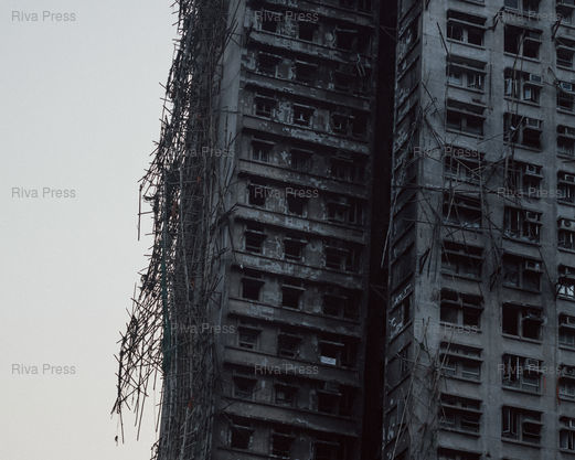 Légende : Les immeubles résidentiels de 'Wang Fuk Court' une semaine après l'incendie ayant fait au moins 159 morts . Tai Po, Nouveaux territoires, Hong Kong, le 4 décembre 2025. © Lucien Lung / Riva Press ***