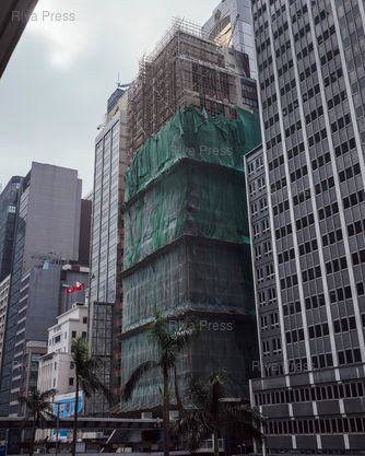 Légende : Des ouvriers retirent les filets de protection entourant un immeuble et son échafaudage en bambou, une semaine après l'incendie d'immeubles d'habitation à Tai Po ayant fait au moins 146 morts, alors que les premiers éléments de l'enquête indiquent que les filets de protection n'étaient pas aux normes antifeu et ont contribué à la propagation rapide de l'incendie. Dans le quartier de Central, à Hong Kong, le 4 décembre 2025. © Lucien Lung / Riva Press *** Workers remove the protective netting surrounding a building and its bamboo scaffolding, a week after the Tai Po apartment building fire that killed at least 146 people, as initial findings of the investigation indicate the netting did not meet fire safety standards and contributed to the rapid spread of the blaze. Central district, Hong Kong, December 4, 2025. © Lucien Lung / Riva Press