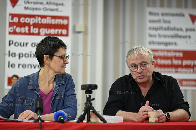 Légende : Nathalie Arthaud, Porte-parole de Lutte ouvrière, annonce sa candidature à l'élection présidentielle lors d'une conférence de presse. Avec Jean-Pierre Mercier, porte-parole de LO /// Nathalie Arthaud, spokesperson for Lutte Ouvrière, French Trotskyist, far-left, communist, revolutionary political party, announces her candidacy for the presidential election at a press conference. With Jean-Pierre Mercier, spokesperson for LO - Paris - 08/12/2025 - Photo © Lionel Préau +33 (0)6 68 12 83 77