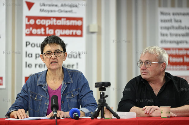 Légende : Nathalie Arthaud, Porte-parole de Lutte ouvrière, annonce sa candidature à l'élection présidentielle lors d'une conférence de presse. Avec Jean-Pierre Mercier, porte-parole de LO /// Nathalie Arthaud, spokesperson for Lutte Ouvrière, French Trotskyist, far-left, communist, revolutionary political party, announces her candidacy for the presidential election at a press conference. With Jean-Pierre Mercier, spokesperson for LO - Paris - 08/12/2025 - Photo © Lionel Préau +33 (0)6 68 12 83 77