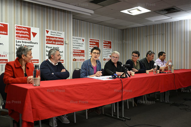 Légende : Nathalie Arthaud, Porte-parole de Lutte ouvrière, annonce sa candidature à l'élection présidentielle lors d'une conférence de presse. Avec Jean-Pierre Mercier, porte-parole de LO, et autres candidats LO aux municipales /// Nathalie Arthaud, spokesperson for Lutte Ouvrière, French Trotskyist, far-left, communist, revolutionary political party, announces her candidacy for the presidential election at a press conference. With Jean-Pierre Mercier, spokesperson for LO, and other candidates to the municipal elections - Paris - 08/12/2025 - Photo © Lionel Préau +33 (0)6 68 12 83 77