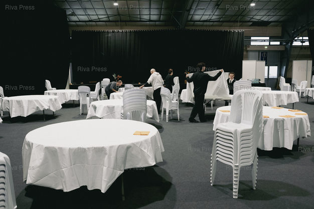 *** Albi, November 14, 2025 - Employees prepare the catering area during the 94th French Departments Conference. PHOTO: Vincent NGUYEN / Riva Press