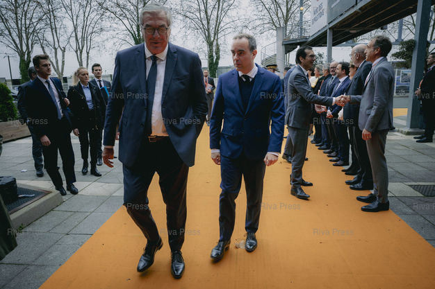 *** Albi, November 14, 2025 - Prime Minister Sébastien Lecornu arrives at the 94th Conference of French Departments. With François Sauvadet (left), President of French Departments, and Jean-Pierre Farandou (right), Minister of Labor and Solidarity. PHOTO: Vincent NGUYEN / Riva Press