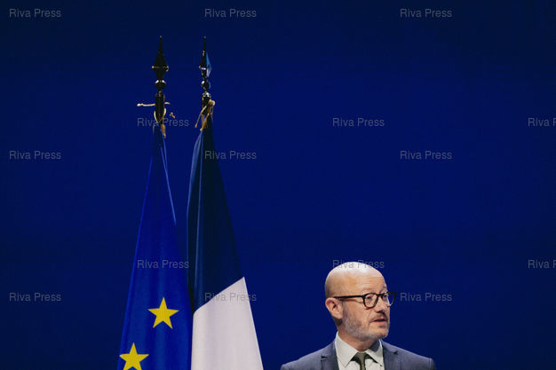 *** Albi, November 14, 2025 - Jean-Luc Gleize, president of the left-wing group and president of the Gironde Departmental Council, delivers a speech at the 94th Conference of French Departments. PHOTO: Vincent NGUYEN / Riva Press