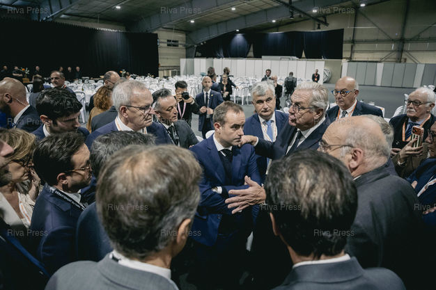 *** Albi, November 14, 2025 - Prime Minister Sébastien Lecornu meets with presidents of departmental councils during the 94th Conference of Departments of France. With François Sauvadet (D, who has his arm around him), president of Departments of France. PHOTO: Vincent NGUYEN / Riva Press