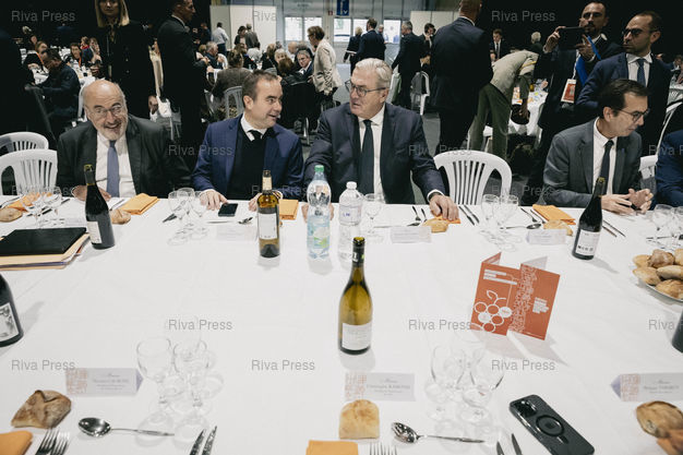 *** Albi, November 14, 2025 - Jean-Léonce Dupont (left), President of the Calvados Departmental Council, Prime Minister Sébastien Lecornu, François Sauvadet, President of Departments of France, and Jean-Pierre Farandou (left to right), Minister of Labor and Solidarity, are seated for lunch during the 94th Departments of France Conference. PHOTO: Vincent NGUYEN / Riva Press