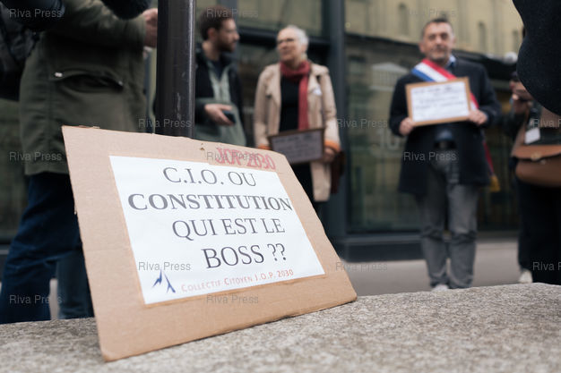 Légende : Manifestation du collectif citoyen JOP 2030 devant l'Assemblee nationale pour s'opposer a la tenue des Jeux olympiques et paralympiques d'hiver 2030 dans les Alpes françaises. Les manifestants ont interpelle les députes pour protester contre les consequences environnementales des JOP, le poids financier de leur organisation pour les collectivites territoriales et le manque de consultation de la population. Paris, le 10 decembre 2025. Teo Manisier / Riva Press /// Protest by the JOP 2030 citizens' group in front of the Parliament to oppose the 2030 Winter Olympics and Paralympics being held in the French Alps. The protesters called on MPs to protest against the environmental consequences of the Winter Olympics, the financial burden of organizing them for local authorities, and the lack of consultation with the population. Paris, December 10, 2025. Teo Manisier / Riva Press