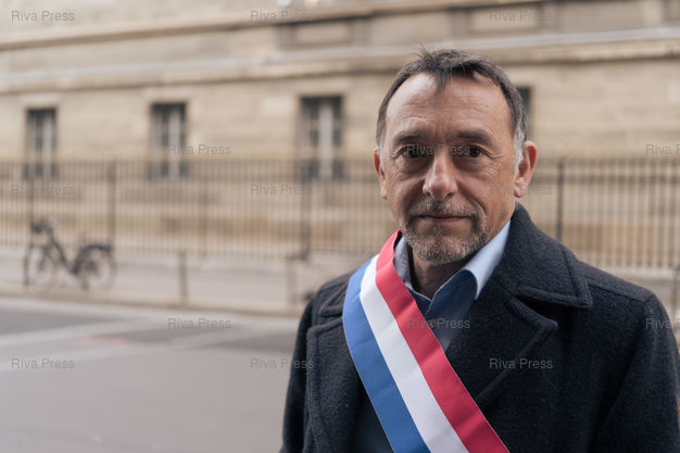 Caption : Le depute LFI Jean Francois Coulomme a la manifestation du collectif citoyen JOP 2030 devant l'Assemblée nationale pour s'opposer a la tenue des Jeux olympiques et paralympiques d'hiver 2030 dans les Alpes françaises. Les manifestants ont interpellé les députés pour protester contre les consequences environnementales des JOP, le poids financier de leur organisation pour les collectivites territoriales et le manque de consultation de la population. Paris, le 10 decembre 2025. Teo Manisier / Riva Press /// French MP (LFI) Jean Francois Coulomme at the protest by the JOP 2030 citizens' group in front of the Parliament to oppose the 2030 Winter Olympics and Paralympics being held in the French Alps. The protesters called on MPs to protest against the environmental consequences of the Winter Olympics, the financial burden of organizing them for local authorities, and the lack of consultation with the population. Paris, December 10, 2025. Teo Manisier / Riva Press