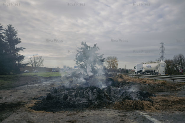 Légende : Muret, le 17 décembre 2025 - La voie de l'autoroute A64 vers Toulouse est bloquée à Muret au niveau de la sortie 35 par une intersyndicale d'agriculteurs qui manifestent contre la politique d'abattage de la totalité des troupeaux de vaches en cas de découverte d'un cas de dermatose nodulaire contagieuse (DNC) parmi elles. PHOTO: Vincent NGUYEN / Riva Press