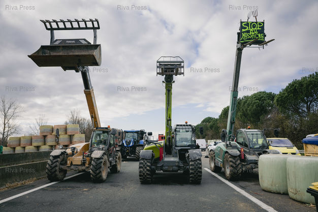 Légende : Carbonne, le 17 décembre 2025 - La voie de l'autoroute A64 vers Toulouse est bloquée à Carbonne par les Ultras de l'A64, des agriculteurs menés par Jérôme Bayle, qui manifestent contre la politique d'abattage de la totalité des troupeaux de vaches en cas de découverte d'un cas de dermatose nodulaire contagieuse (DNC) parmi elles. PHOTO: Vincent NGUYEN / Riva Press