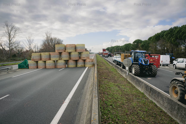 Légende : Carbonne, le 17 décembre 2025 - La voie de l'autoroute A64 vers Toulouse est bloquée à Carbonne par les Ultras de l'A64, des agriculteurs menés par Jérôme Bayle, qui manifestent contre la politique d'abattage de la totalité des troupeaux de vaches en cas de découverte d'un cas de dermatose nodulaire contagieuse (DNC) parmi elles. PHOTO: Vincent NGUYEN / Riva Press
