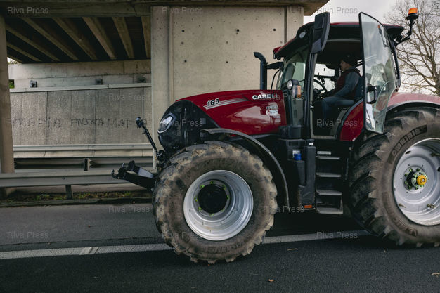 Légende : Carbonne, le 17 décembre 2025 - Tags anti-FNSEA. La voie de l'autoroute A64 vers Toulouse est bloquée à Carbonne par les Ultras de l'A64, des agriculteurs menés par Jérôme Bayle, qui manifestent contre la politique d'abattage de la totalité des troupeaux de vaches en cas de découverte d'un cas de dermatose nodulaire contagieuse (DNC) parmi elles. PHOTO: Vincent NGUYEN / Riva Press