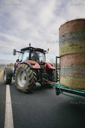 Légende : Carbonne, le 17 décembre 2025 - La voie de l'autoroute A64 vers Toulouse est bloquée à Carbonne par les Ultras de l'A64, des agriculteurs menés par Jérôme Bayle, qui manifestent contre la politique d'abattage de la totalité des troupeaux de vaches en cas de découverte d'un cas de dermatose nodulaire contagieuse (DNC) parmi elles. PHOTO: Vincent NGUYEN / Riva Press