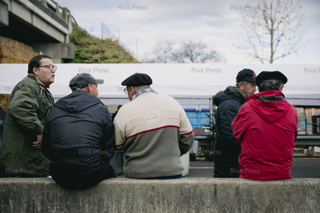 Légende : Carbonne, le 17 décembre 2025 - La voie de l'autoroute A64 vers Toulouse est bloquée à Carbonne par les Ultras de l'A64, des agriculteurs menés par Jérôme Bayle, qui manifestent contre la politique d'abattage de la totalité des troupeaux de vaches en cas de découverte d'un cas de dermatose nodulaire contagieuse (DNC) parmi elles. Ici des sympathisants venus soutenir les agriculteurs sur le barrage. PHOTO: Vincent NGUYEN / Riva Press