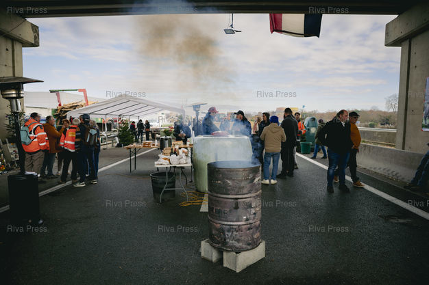 Légende : Carbonne, le 17 décembre 2025 - La voie de l'autoroute A64 vers Toulouse est bloquée à Carbonne par les Ultras de l'A64, des agriculteurs menés par Jérôme Bayle, qui manifestent contre la politique d'abattage de la totalité des troupeaux de vaches en cas de découverte d'un cas de dermatose nodulaire contagieuse (DNC) parmi elles. PHOTO: Vincent NGUYEN / Riva Press
