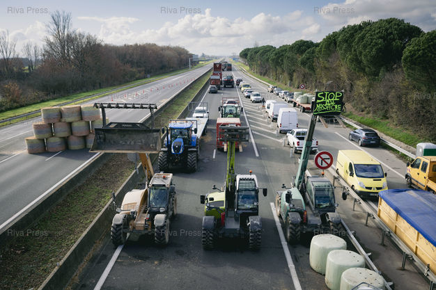 Légende : Carbonne, le 17 décembre 2025 - La voie de l'autoroute A64 vers Toulouse est bloquée à Carbonne par les Ultras de l'A64, des agriculteurs menés par Jérôme Bayle, qui manifestent contre la politique d'abattage de la totalité des troupeaux de vaches en cas de découverte d'un cas de dermatose nodulaire contagieuse (DNC) parmi elles. PHOTO: Vincent NGUYEN / Riva Press