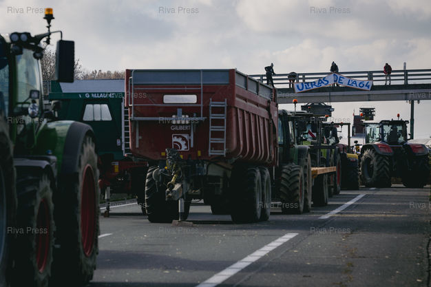 Légende : Carbonne, le 17 décembre 2025 - La voie de l'autoroute A64 vers Toulouse est bloquée à Carbonne par les Ultras de l'A64, des agriculteurs menés par Jérôme Bayle, qui manifestent contre la politique d'abattage de la totalité des troupeaux de vaches en cas de découverte d'un cas de dermatose nodulaire contagieuse (DNC) parmi elles. PHOTO: Vincent NGUYEN / Riva Press