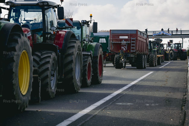 Légende : Carbonne, le 17 décembre 2025 - La voie de l'autoroute A64 vers Toulouse est bloquée à Carbonne par les Ultras de l'A64, des agriculteurs menés par Jérôme Bayle, qui manifestent contre la politique d'abattage de la totalité des troupeaux de vaches en cas de découverte d'un cas de dermatose nodulaire contagieuse (DNC) parmi elles. PHOTO: Vincent NGUYEN / Riva Press