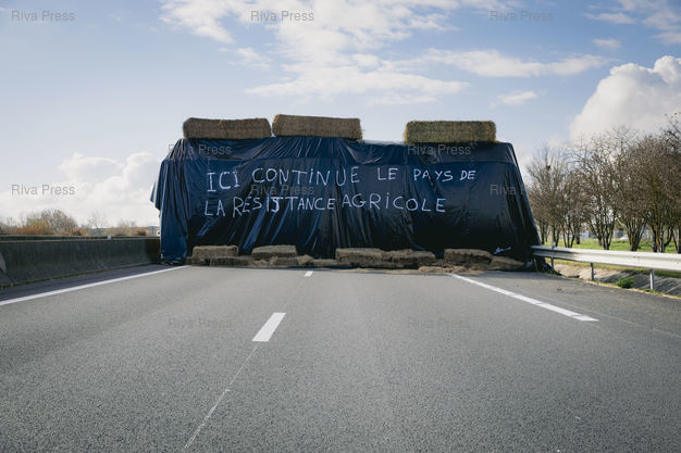 Légende : Carbonne, le 17 décembre 2025 - La voie de l'autoroute A64 vers Toulouse est bloquée à Carbonne par les Ultras de l'A64, des agriculteurs menés par Jérôme Bayle, qui manifestent contre la politique d'abattage de la totalité des troupeaux de vaches en cas de découverte d'un cas de dermatose nodulaire contagieuse (DNC) parmi elles. PHOTO: Vincent NGUYEN / Riva Press