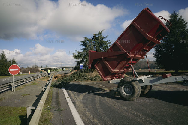 Légende : Muret, le 17 décembre 2025 - La voie de l'autoroute A64 vers Toulouse est bloquée à Muret au niveau de la sortie 35 par une intersyndicale d'agriculteurs (ici des syndicalistes de la Coordination Rurale 31 et de la FNSEA) qui manifestent contre la politique d'abattage de la totalité des troupeaux de vaches en cas de découverte d'un cas de dermatose nodulaire contagieuse (DNC) parmi elles. Un militant de la CR s'est installé en haut de l'arbre qui bloque la voie. PHOTO: Vincent NGUYEN / Riva Press