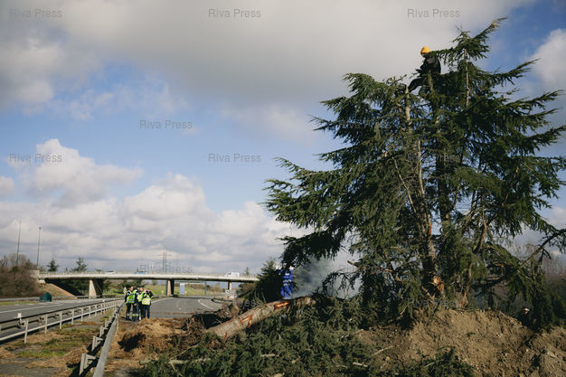 Légende : Muret, le 17 décembre 2025 - La voie de l'autoroute A64 vers Toulouse est bloquée à Muret au niveau de la sortie 35 par une intersyndicale d'agriculteurs (ici des syndicalistes de la Coordination Rurale 31 et de la FNSEA) qui manifestent contre la politique d'abattage de la totalité des troupeaux de vaches en cas de découverte d'un cas de dermatose nodulaire contagieuse (DNC) parmi elles. Un militant de la CR s'est installé en haut de l'arbre qui bloque la voie. PHOTO: Vincent NGUYEN / Riva Press
