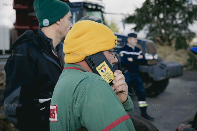 Légende : Muret, le 17 décembre 2025 - La voie de l'autoroute A64 vers Toulouse est bloquée à Muret au niveau de la sortie 35 par une intersyndicale d'agriculteurs (ici des syndicalistes de la Coordination Rurale 31 et de la FNSEA) qui manifestent contre la politique d'abattage de la totalité des troupeaux de vaches en cas de découverte d'un cas de dermatose nodulaire contagieuse (DNC) parmi elles. PHOTO: Vincent NGUYEN / Riva Press