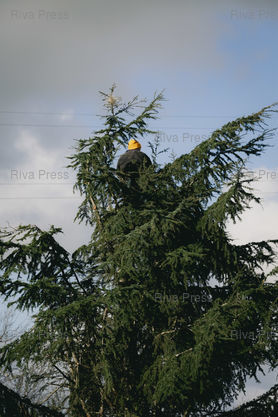 Légende : Muret, le 17 décembre 2025 - La voie de l'autoroute A64 vers Toulouse est bloquée à Muret au niveau de la sortie 35 par une intersyndicale d'agriculteurs (ici des syndicalistes de la Coordination Rurale 31 et de la FNSEA) qui manifestent contre la politique d'abattage de la totalité des troupeaux de vaches en cas de découverte d'un cas de dermatose nodulaire contagieuse (DNC) parmi elles. Un militant de la CR s'est installé en haut de l'arbre qui bloque la voie. PHOTO: Vincent NGUYEN / Riva Press