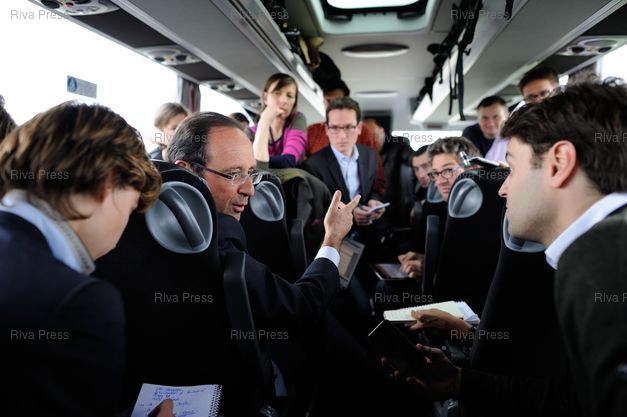 François Hollande échange avec les rédacteurs dans le bus conduisant les journalistes vers Saint-Dizier - Photo © Lionel Préau +33 (0)6 68 12 83 77