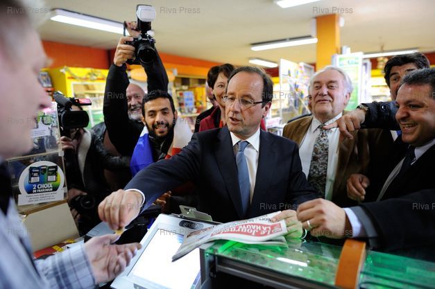 Légende : François Hollande, candidat du Parti Socialiste à l'élection présidentielle, à la rencontre des habitants de Haute-Marne et des Ardennes.