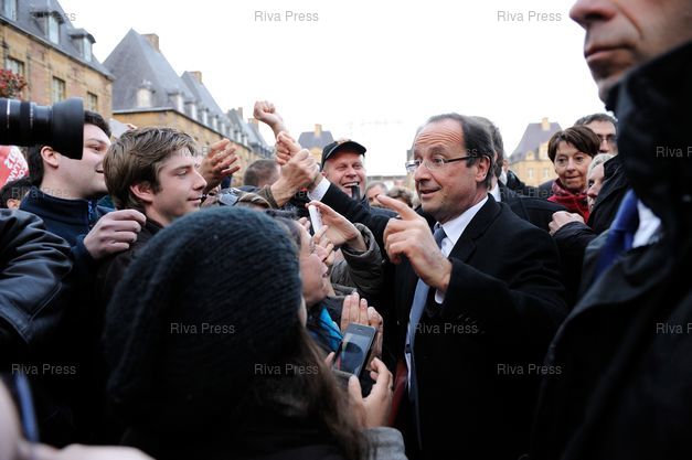Légende : François Hollande, candidat du Parti Socialiste à l'élection présidentielle, à la rencontre des habitants de Haute-Marne et des Ardennes.