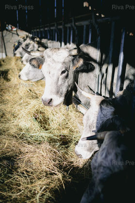 Légende : Montbel, le 18 décembre 2025 - Des vaches gasconnes dans l'exploitation de David Eychenne, paysan éleveur bovin en bio à Montbel dans l'Ariège et co-porte-parole de la Confédération Paysanne Occitanie. PHOTO: Vincent NGUYEN / Riva Press