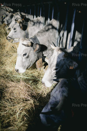 Légende : Montbel, le 18 décembre 2025 - Des vaches gasconnes dans l'exploitation de David Eychenne, paysan éleveur bovin en bio à Montbel dans l'Ariège et co-porte-parole de la Confédération Paysanne Occitanie. PHOTO: Vincent NGUYEN / Riva Press