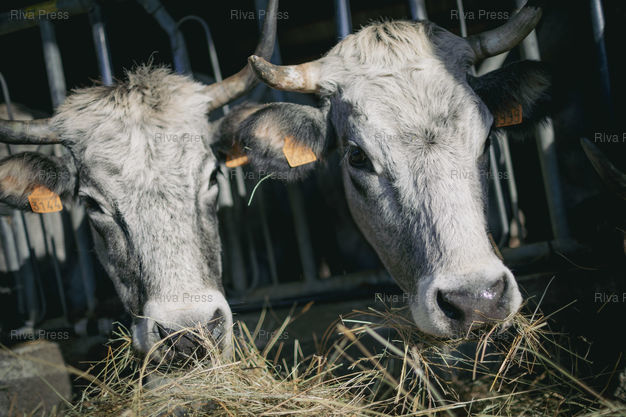 Légende : Montbel, le 18 décembre 2025 - Des vaches gasconnes dans l'exploitation de David Eychenne, paysan éleveur bovin en bio à Montbel dans l'Ariège et co-porte-parole de la Confédération Paysanne Occitanie. PHOTO: Vincent NGUYEN / Riva Press