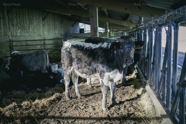 Légende : Montbel, le 18 décembre 2025 - Des veaux destinés à la reproduction dans l'exploitation de David Eychenne, paysan éleveur bovin en bio à Montbel dans l'Ariège et co-porte-parole de la Confédération Paysanne Occitanie. PHOTO: Vincent NGUYEN / Riva Press