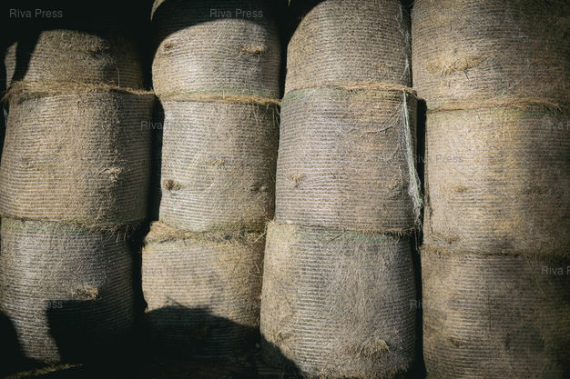 Légende : Montbel, le 18 décembre 2025 - Réserves de foin dans l'exploitation de David Eychenne, paysan éleveur bovin en bio à Montbel dans l'Ariège et co-porte-parole de la Confédération Paysanne Occitanie. PHOTO: Vincent NGUYEN / Riva Press