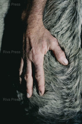Légende : Montbel, le 18 décembre 2025 - David Eychenne, paysan éleveur bovin en bio à Montbel dans l'Ariège et co-porte-parole de la Confédération Paysanne Occitanie carresse son bétail et vérifie la présence d'éventuelles nodules, symptomes de la DNC (Dermatose nodulaire contagieuse). PHOTO: Vincent NGUYEN / Riva Press