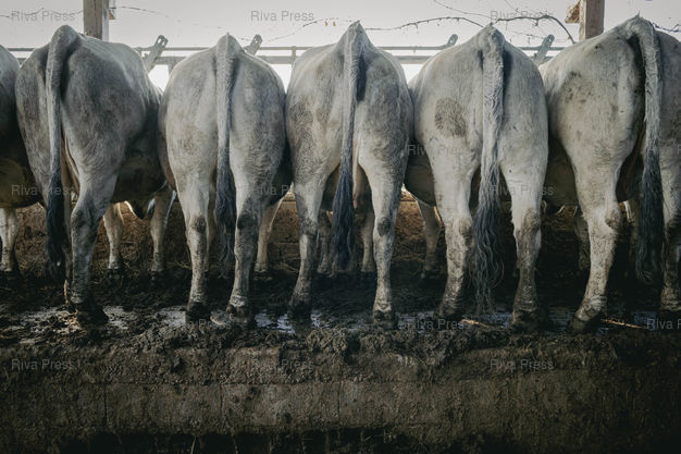 Légende : Montbel, le 18 décembre 2025 - Des vaches gasconnes dans l'exploitation de David Eychenne, paysan éleveur bovin en bio à Montbel dans l'Ariège et co-porte-parole de la Confédération Paysanne Occitanie. PHOTO: Vincent NGUYEN / Riva Press