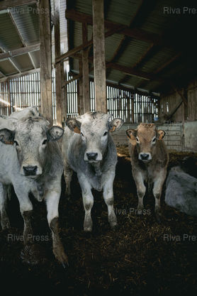 Légende : Montbel, le 18 décembre 2025 - Des veaux et vaches gasconnes dans l'exploitation de David Eychenne, paysan éleveur bovin en bio à Montbel dans l'Ariège et co-porte-parole de la Confédération Paysanne Occitanie. PHOTO: Vincent NGUYEN / Riva Press