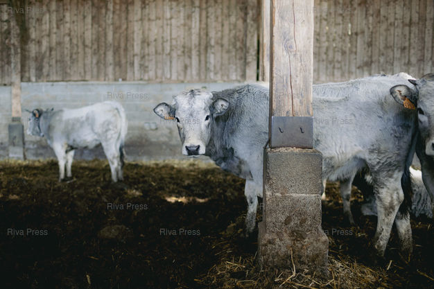 Légende : Montbel, le 18 décembre 2025 - Des veaux et vaches gasconnes dans l'exploitation de David Eychenne, paysan éleveur bovin en bio à Montbel dans l'Ariège et co-porte-parole de la Confédération Paysanne Occitanie. PHOTO: Vincent NGUYEN / Riva Press