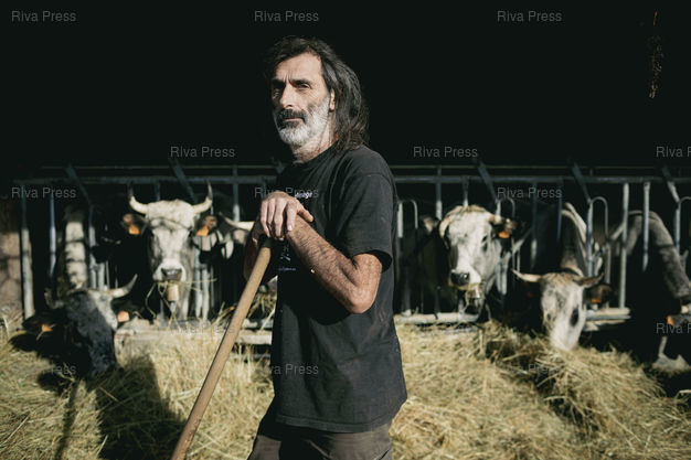 Légende : Montbel, le 18 décembre 2025 - David Eychenne, paysan éleveur bovin en bio à Montbel dans l'Ariège et co-porte-parole de la Confédération Paysanne Occitanie. PHOTO: Vincent NGUYEN / Riva Press