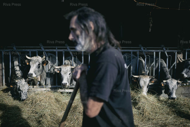Légende : Montbel, le 18 décembre 2025 - David Eychenne, paysan éleveur bovin en bio à Montbel dans l'Ariège et co-porte-parole de la Confédération Paysanne Occitanie. PHOTO: Vincent NGUYEN / Riva Press