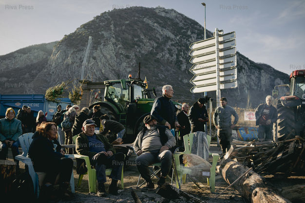 Légende : Tarascon-sur-Ariège, le 18 décembre 2025 - Les éleveurs et agriculteurs bloquent un rond-point sur la N20 à Tarascon-sur-Ariège pour protester contre le protocole imposant l'abattage du troupeau de bovins si un cas de DNC (Dermatose nodulaire contagieuse) est découvert. Un blocage intersyndical avec la Confédération Paysanne et la Coordination Rurale 09 qui dénoncent également le traité sur le Mercosur. PHOTO: Vincent NGUYEN / Riva Press