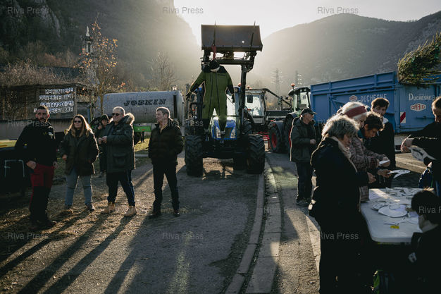 Légende : Tarascon-sur-Ariège, le 18 décembre 2025 - Les éleveurs et agriculteurs bloquent un rond-point sur la N20 à Tarascon-sur-Ariège pour protester contre le protocole imposant l'abattage du troupeau de bovins si un cas de DNC (Dermatose nodulaire contagieuse) est découvert. Un blocage intersyndical avec la Confédération Paysanne et la Coordination Rurale 09 qui dénoncent également le traité sur le Mercosur. PHOTO: Vincent NGUYEN / Riva Press