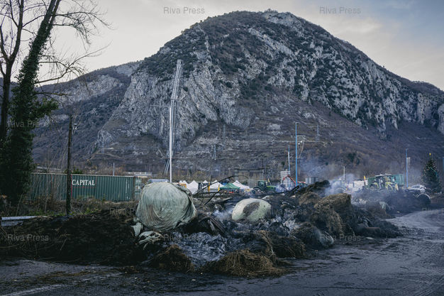 Légende : Tarascon-sur-Ariège, le 18 décembre 2025 - Les éleveurs et agriculteurs bloquent un rond-point sur la N20 à Tarascon-sur-Ariège pour protester contre le protocole imposant l'abattage du troupeau de bovins si un cas de DNC (Dermatose nodulaire contagieuse) est découvert. Un blocage intersyndical avec la Confédération Paysanne et la Coordination Rurale 09 qui dénoncent également le traité sur le Mercosur. PHOTO: Vincent NGUYEN / Riva Press
