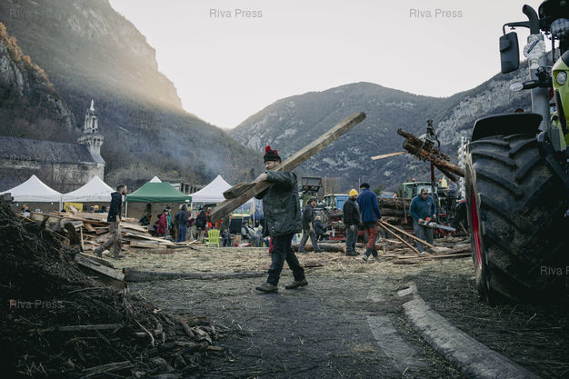Légende : Tarascon-sur-Ariège, le 18 décembre 2025 - Les éleveurs et agriculteurs bloquent un rond-point sur la N20 à Tarascon-sur-Ariège pour protester contre le protocole imposant l'abattage du troupeau de bovins si un cas de DNC (Dermatose nodulaire contagieuse) est découvert. Un blocage intersyndical avec la Confédération Paysanne et la Coordination Rurale 09 qui dénoncent également le traité sur le Mercosur. PHOTO: Vincent NGUYEN / Riva Press